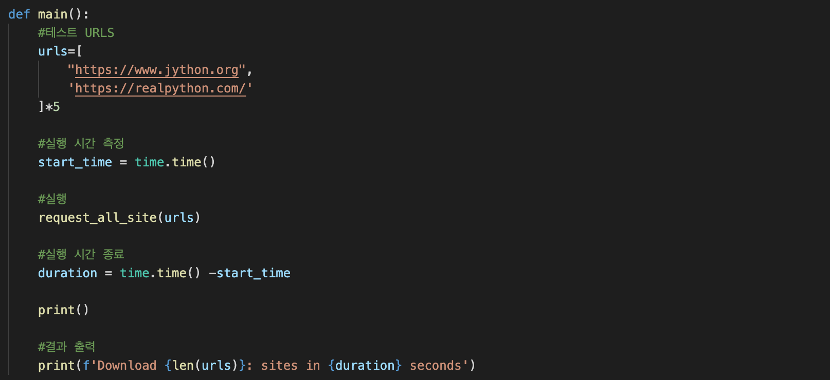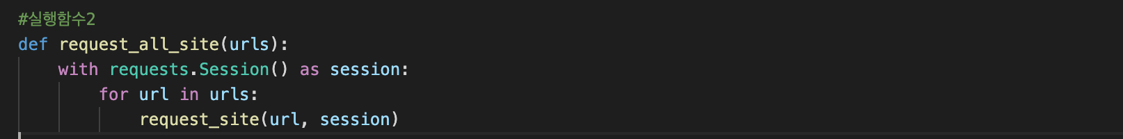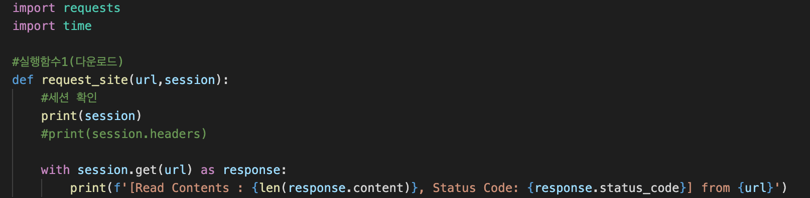 - 실행함수2 : 주어진 url들 파라미터 넣고, requests.Session()을 session으로 넣어서 request_site 실행함