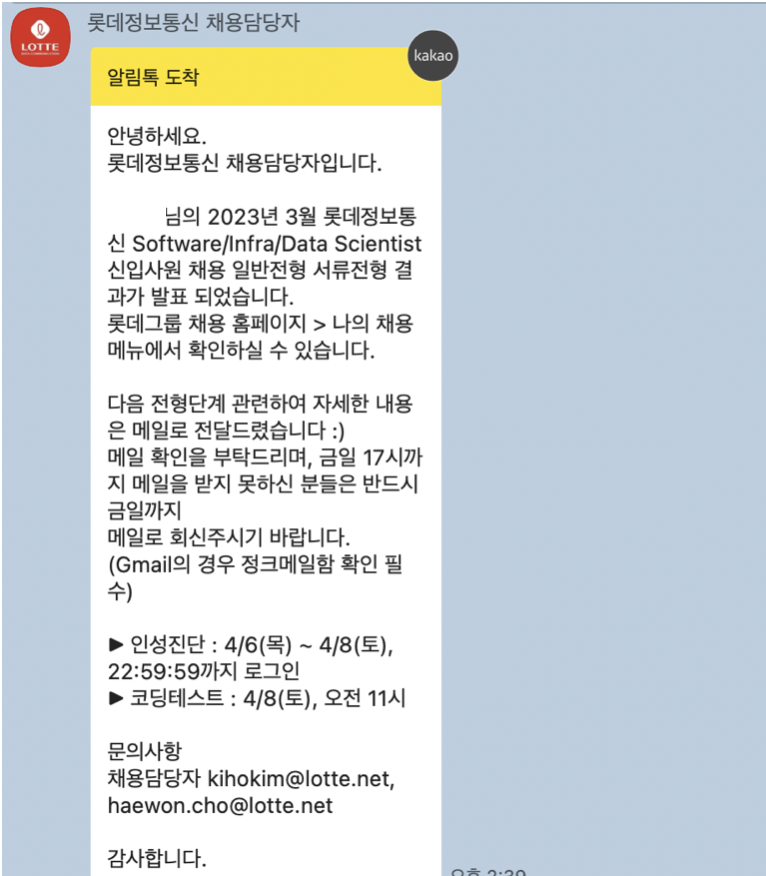 카페에 공부하러 갔는데 이런 카톡이 왔다. 결과가 나왔으니 확인하라는데, 밑에 코테/인성 검사 안내가 나와있어서 서류 합격인가 싶었다.