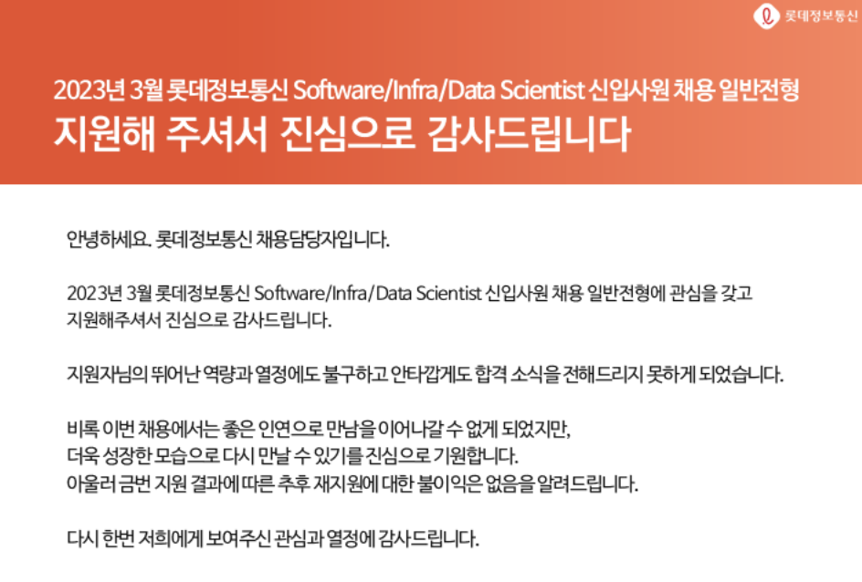 그렇게 코테를 본 뒤 며칠 뒤 날아온 불합격 통지. 아쉬웠지만 그래도 서류 합격도 하고, 코테도 볼 수 있어서 유익했던 시간이었다. 또한 코테에서 나의 부족함을 또한번 느끼게 된 경험이었다.
