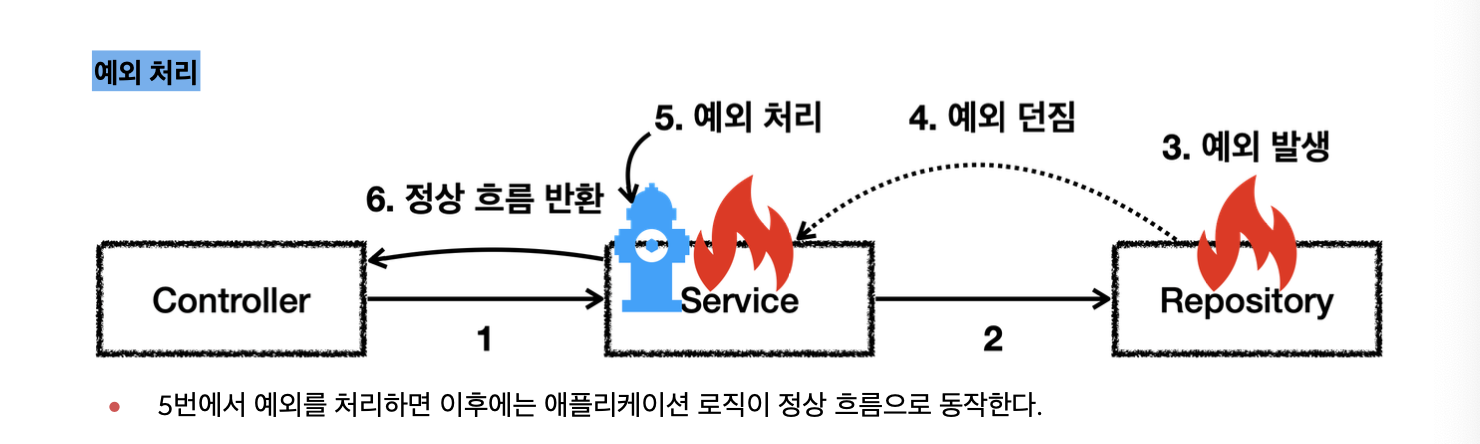 예외처리는 예외를 잡아서 처리하는 것으로, 예외 처리 후에는 애플리케이션 로직이 정상 흐름으로 동작한다.