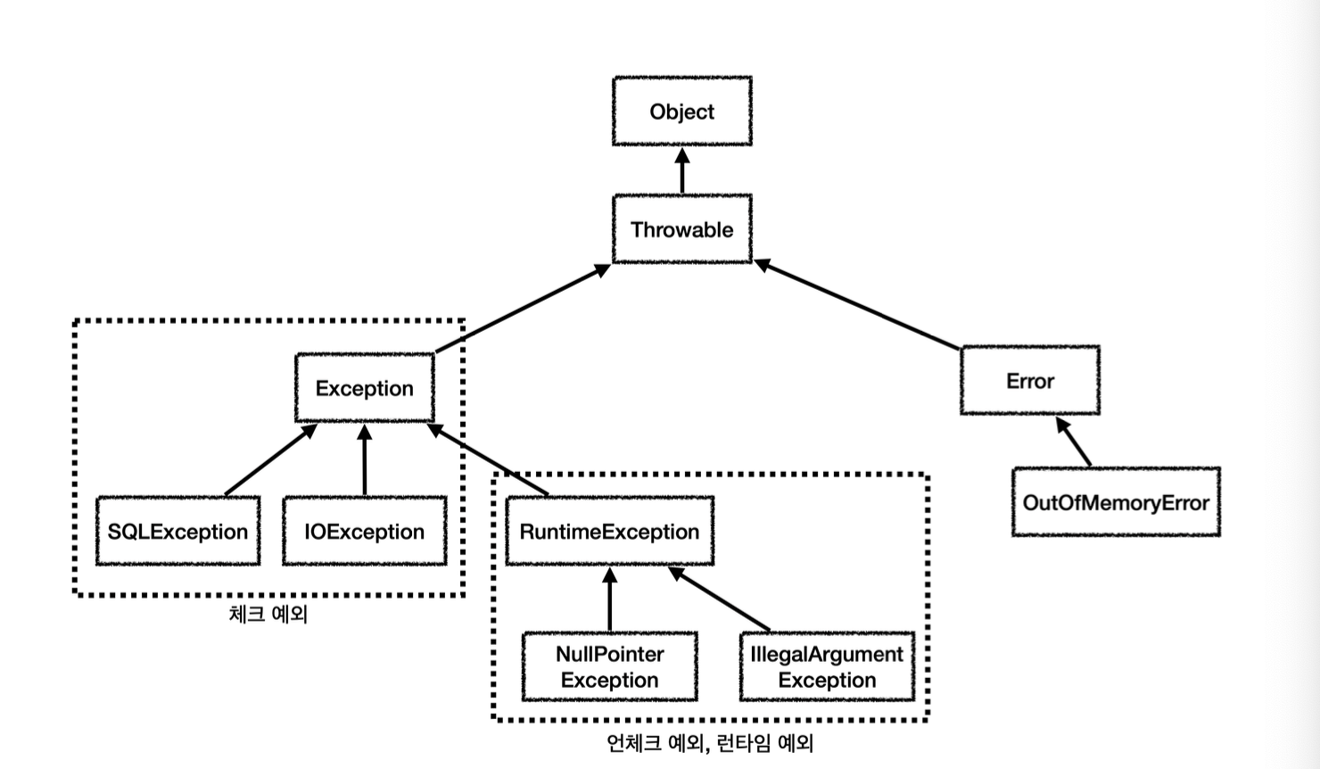- 언체크 예외 : 예외를 잡아서 처리하지 않아도 throws를 생략할 수 있다.