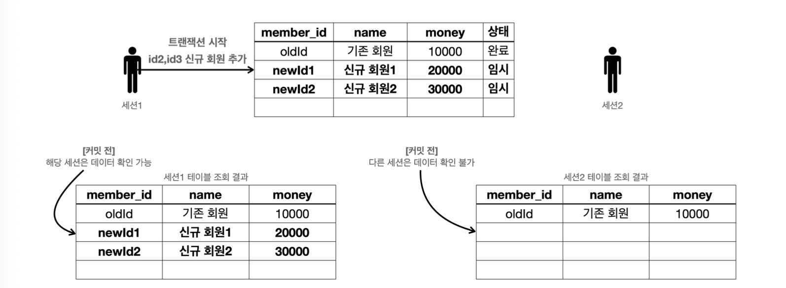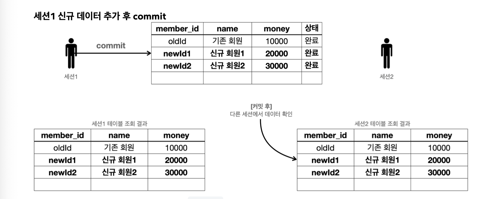 - 따라서 트랜잭션을 시작한 세션(사용자)에게만 변경 데이터가 보이고, 다른 세션(사용자)에게는 변경 데이터가 보이지 않는다