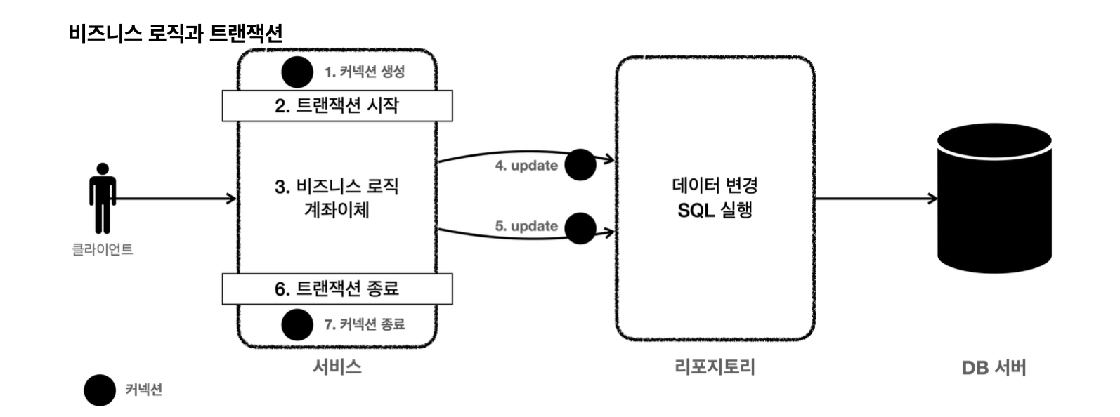 - 트랜잭션을 시작하려면 커넥션이 필요하고, 서비스 계층에서 커넥션을 만들고 커밋과 커넥션을 종료해야한다