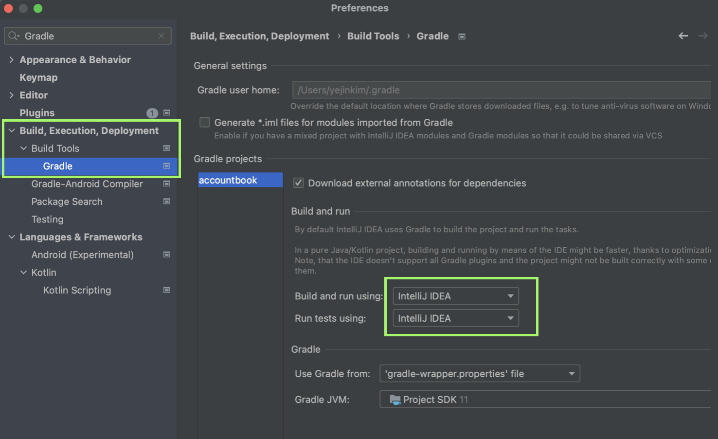 Settings > Build, Execution, Deployment > Build Tools > Gradle -> IntelliJ IDEA