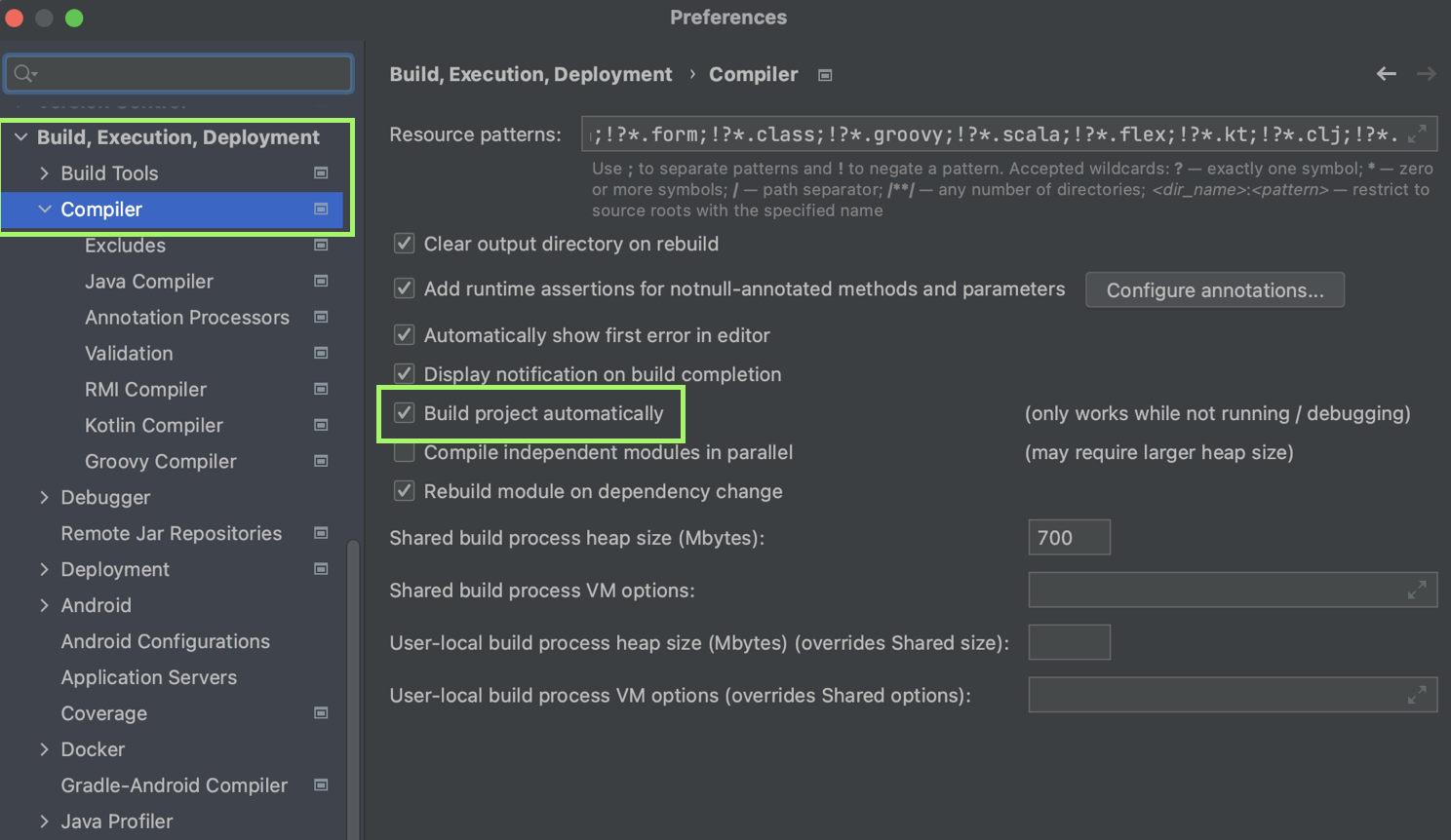 맥북 기준으로 [cmd + ,] 를 누른뒤 Setting으로 이동해 Build > Compiler로 이동해 Build Project Automatically에 체크를 해준다.